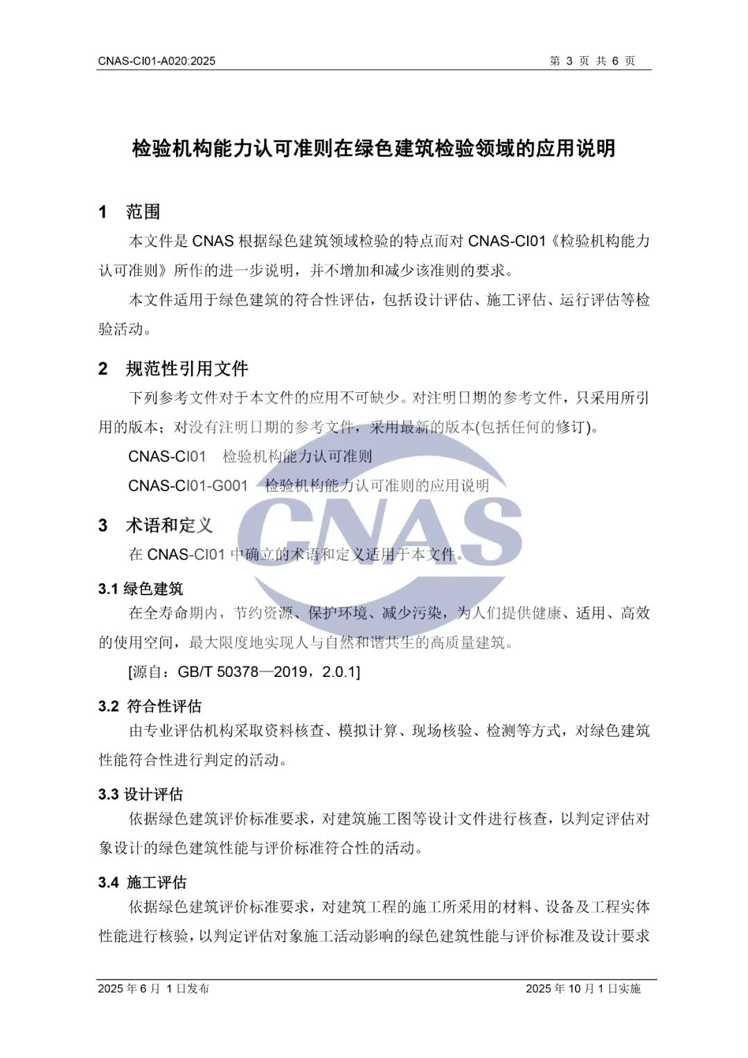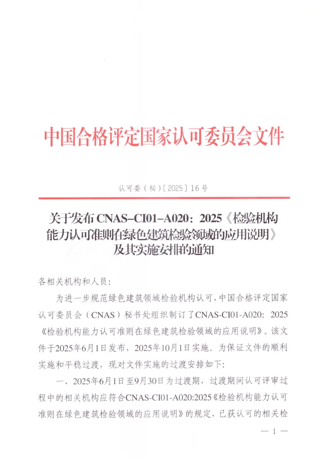 为进一步规范绿色建筑领域检验机构认可,中国合格评定国家认可委员会(CNAS)秘书处近期组织制订了CNAS-CI01-A020:2025《检验机构能力认可准则在绿色建筑检验领域的应用说明》,现已发布,将于2025年10月1日实施。