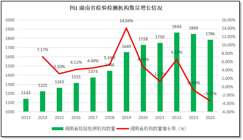 由图1可见,2022年之前,湖南省检验检测机构数量持续保持增长,在2022年增长到1864家的峰值,此后逐年下降,2024年末,湖南省的检验检测机构数是1786家,已经较峰值期2022年净减少78家。从年度增长率曲线来看,湖南省检验检测机构数量的增长率在2018年之前增幅较为平稳,在2019年出现一个增长高峰,同比增幅达到14.04%。此后增幅开始下降,到2022年止跌回升,出现一个小的反弹,但2023年、2024年连续两年同比增幅均为负数,显示湖南省检验检测行业发展已经从数量增长阶段转入质量提升阶段。