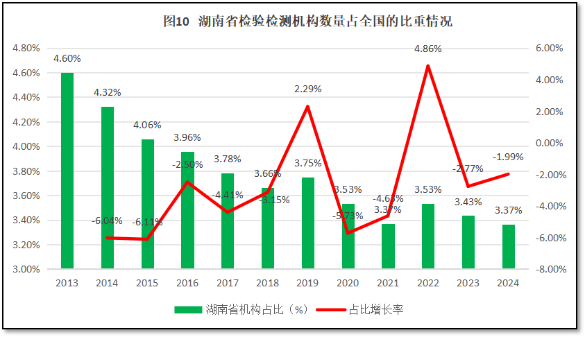 截至2024年末,湖南省检验检测机构数量为1786家,约占全国检验检测机构数量的3.37%,排名全国第11位。过去12年,湖南省检验检测机构数量在全国检验检测行业中的占比以及占比的增长率如图10所示。