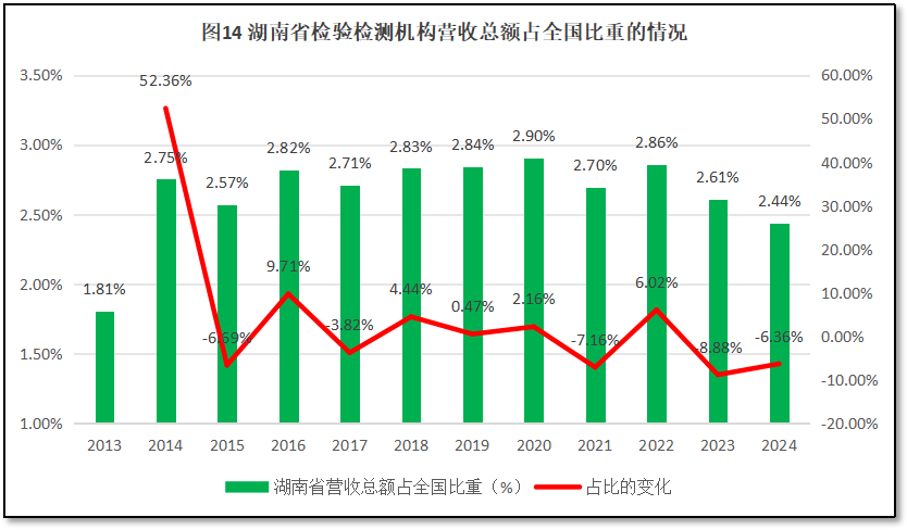 由图14可见,湖南省检验检测机构营收总额在全国检验检测行业营收总额中的比重在2014年达到2.75%后总体来看变动不大,呈现轻微波动的发展特点,近年来占比略有下降,2024年度的占比2.44%,是2014年以来的最低值。从增长率曲线来看,从2015年起,湖南省检验检测机构营收总额增长率缓慢下降,10年来的年均增幅为-1.01%,说明湖南省检验检测机构营业状况相对平稳,但在全行业中的地位略微下降。