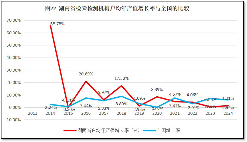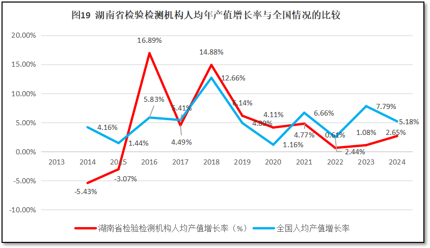 再来看湖南省检验检测机构人均年产值增长率与全国人均年产值增长率的比较,如图19所示。