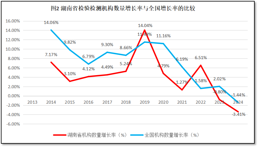 湖南省检验检测机构数量增长率与全国检验检测机构数量的增长率进行比较,如图2所示。