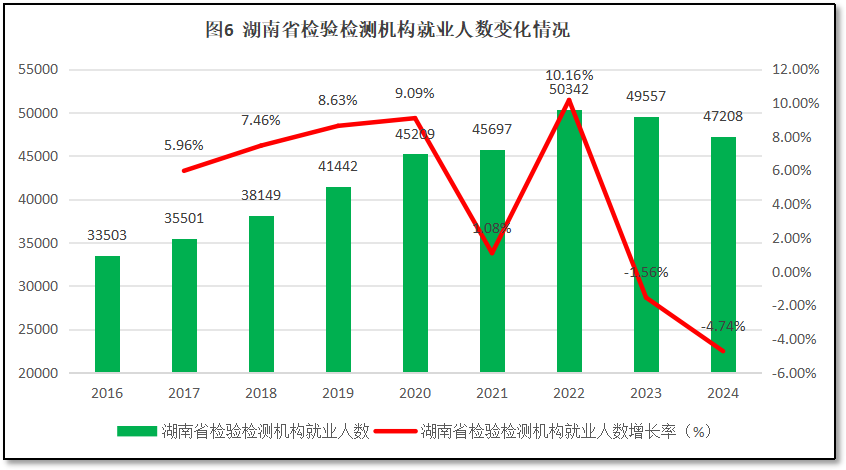 由图6可见,从2016年到2022年,湖南省检验检测机构就业人口数量保持增长,从2016年的3.35万人增长到2022年的5.03万人,年均增速7.06%。但是,此后的两年湖南省检验检测机构从业人数持续下降,2024年度的人数降到4.72万人,已经较最高峰时2022年净减少约3100人。从增长率曲线看,湖南省检验检测机构就业人数增长率在2019年和2022年出现两个接近10%的较高增长峰值,但2023年、2024年连续两年为负值,曲线呈现急速下降的趋势。从就业人数的发展情况来看,湖南省行业收缩的趋势也十分明显。