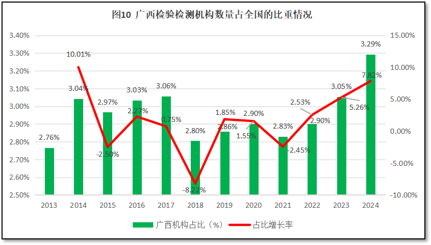 由图10可见,广西壮族自治区检验检测机构数量在全国检验检测机构总数中的占比起伏不定,从2013年的2.76%提升到2014年的3.04%之后,维持了一段时间的稳定,到2018年出现了较大降幅。此后又逐步波动提升,2024年出现较大增长,占比提高到3.29%。从增长率的变化情况来看,总体为先降后增的变化特点,总体增幅不大,年均增幅为1.71%。