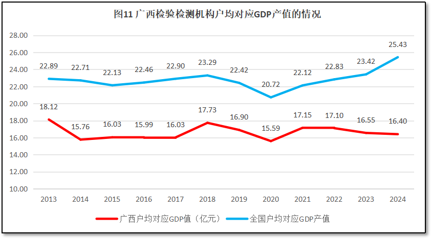 由图11可见,过去12年,广西壮族自治区检验检测机构户均对应的GDP值总体比较平稳,从2013年的18.12亿元下降到2014年的15.76亿元后,基本上就在16亿元附近波动。从广西壮族自治区户均对应GDP的值与全国情况进行比较可见,广西壮族自治区的数值一直比全国平均数要低,最近几年两者的差距有所扩大,2024年度的差距达到8亿元左右。广西壮族自治区的数据变化趋势表明,虽然广西区域经济增长较快,但由于检验检测机构数量保持增长,检验检测机构数量相对过剩的问题日益严重。