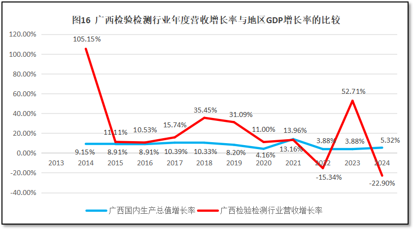 由图16可见,刨除2014年的异常数据之外,广西壮族自治区检验检测机构年度营收总额的增长率在2015年至2021年期间保持快速增长,增长率均高于当地GDP增长率。但2022年和2024年两次出现低于当地经济增长速度的情况,这说明最近几年广西检验检测行业发展不够稳定,发展速度时快时慢,正处于行业转型变革的过程之中。