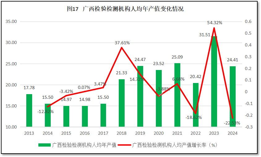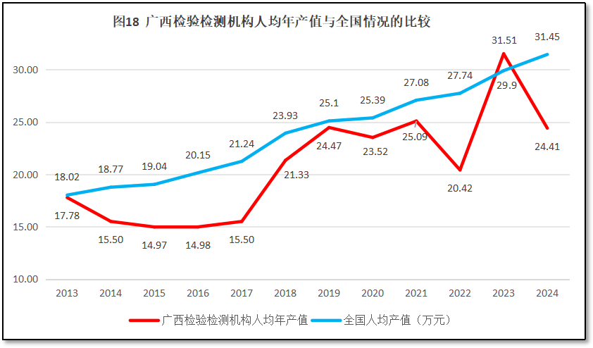 人均年产值是衡量检验检测机构经营运行质量的直观指标。2024年度,广西壮族自治区检验检测机构人均年产值24.41万元,在2023年短暂超过30万元行业温饱线和当年29.9万元的全行业人均产值后,2024年又大幅回落,排名跌到第15位,较2023年度排名下降了6位,从相对靠前的水平掉落中等水平。这表明广西壮族自治区地区检验检测机构经营状况不稳定,刨除可能的数据误差,其市场波动幅度很大,带来劳动生产率的忽高忽低。过去12年广西壮族自治区检验检测机构人均年产值的变化情况如图17所示。