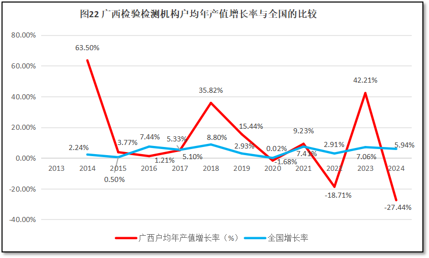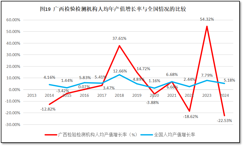再来看广西壮族自治区检验检测机构人均年产值增长率与全国人均年产值增长率的比较,如图19所示。