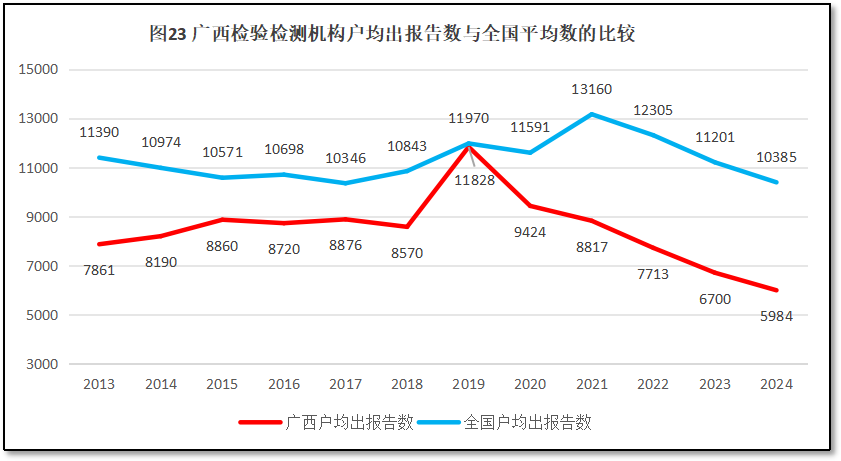 由图23可见,12年来,广西壮族自治区检验检测机构户均出报告数量出现缓慢增高又缓慢下降的发展趋势,2013年时户均出报告7861份,到2019年提升到11828份,到2024年下滑到5984份。2019年以来,由于广西壮族自治区户均出具报告数量呈现逐步减少的趋势,与全国的平均数的差距基本保持在4000份左右。