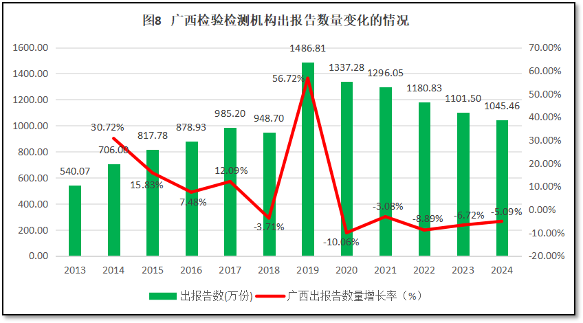 从图8来看,12年来,广西壮族自治区检验检测机构对外出具的检验检测报告数量呈现一个先增后降的变化特点,从2013年的540.07万份逐步增长到2019年1486.81万份的峰值,此后逐年下降。2024年广西壮族自治区检验检测机构出具的报告数量1045.46万份,是2013年出报告数量的1.94倍。从增长率曲线来看,除了2019年出现一个巨大的增长峰值(同比增幅56.72%),广西壮族自治区检验检测机构出具报告数量增长率总体呈现逐步降低的变化趋势,值得注意的是,近五年增长率均为负值,持续处于净减少的状态。